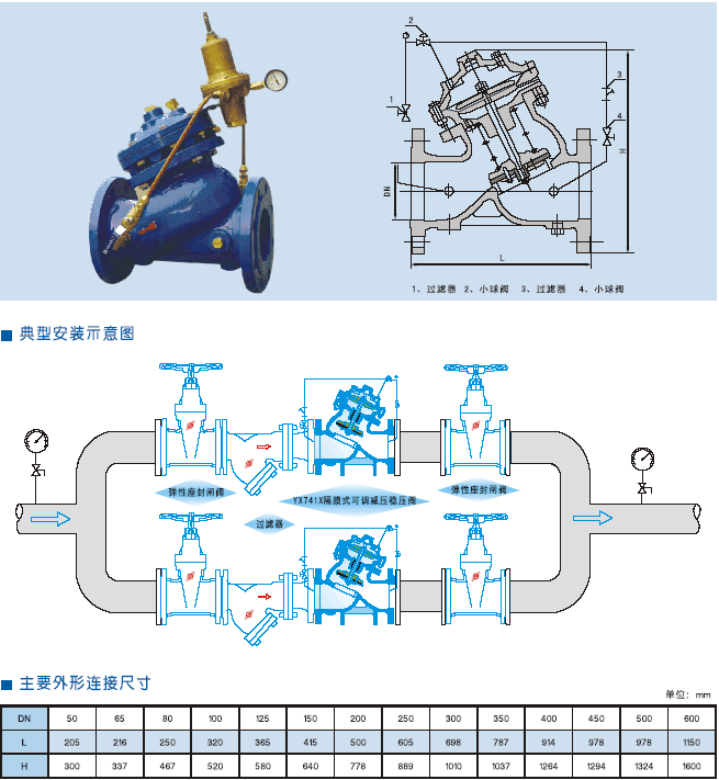 YX741X隔膜可調(diào)式減壓穩(wěn)壓閥是暗安裝于高層建筑給排水系統(tǒng)管道上,將進(jìn)口壓力減至某一需要的出口壓力的特種閥門。該閥門依靠本身能量使出口壓力保持穩(wěn)定在設(shè)定直,即出口壓力不因進(jìn)口壓力及流量的變化而變化,并且閥門控制系統(tǒng)的進(jìn)口處裝有一個自清潔濾網(wǎng),利用流體特性,使比重較大、直徑較大的懸浮顆粒不會進(jìn)入控制系統(tǒng),確保系統(tǒng)循環(huán)暢通無阻,使用門能安全可靠地運行。系統(tǒng)動作靈敏,使用壽命長。 |