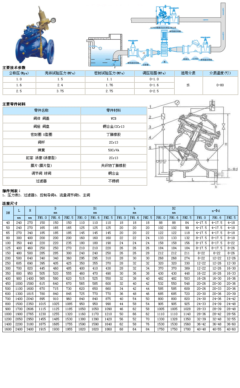 功能與用途本閥門一般安裝在供水管網系統的上游,實現對其下游管網或裝置的減壓穩壓功能。本系列閥門產品廣泛用于高層建筑、生活區域或其它供水管網系統的水壓控制。 |
