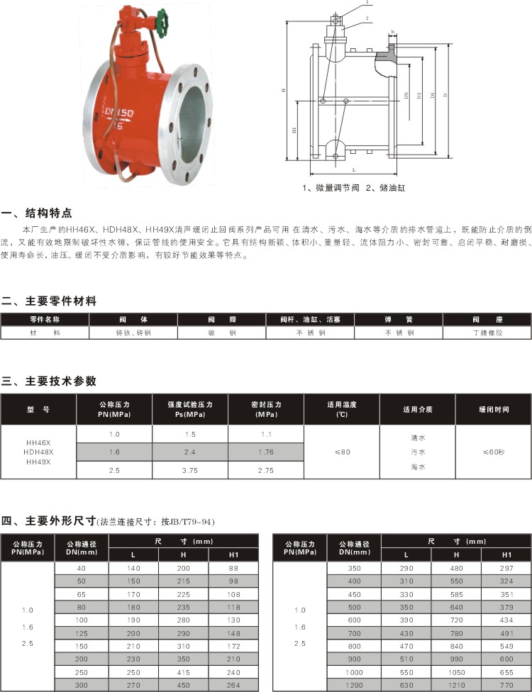 | 公稱通徑:DN40-700 壓力等級(jí):PN1.0-2.5MPa 材質(zhì):碳鋼 產(chǎn)品概述 微阻緩閉止回閥用于給排水管道,安裝在水泵出口處用來(lái)防止介質(zhì)逆流和消除破壞性水錘,并且有效地減少閥門關(guān)閉水錘壓力,可保障管網(wǎng)安全運(yùn)行。止回閥具有閥瓣輕、開(kāi)度大、節(jié)電效果顯著,流體阻力小,水錘消除機(jī)構(gòu)設(shè)計(jì)新穎,密封性能穩(wěn)定可靠、耐磨損、使用壽命長(zhǎng)、運(yùn)行平穩(wěn)、無(wú)振動(dòng)、無(wú)噪聲等特點(diǎn)。 止回閥主要技術(shù)參數(shù) 公稱壓力:1.0~2.5MPa 公稱通經(jīng):40~800mm 適用介質(zhì):水、弱腐蝕性液體 適用溫度:0~80℃(如需要,可達(dá)200℃) 法蘭標(biāo)準(zhǔn):GB/T 17241.6 GB/T 9113 試驗(yàn)標(biāo)準(zhǔn): GB/T 13927 AP1598 主要零部件材料 零件名稱 閥體、閥蓋 閥瓣 閥軸 材料 灰鑄鐵、鑄鋼 鋼板、橡膠組合件 不銹鋼 |